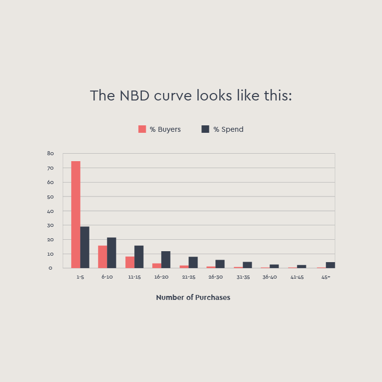 A statistical curve called the Negative Binomial Distribution (NBD) curve was discovered in 1959, and it has been consistently used to predict buyer frequency ratios ever since.7 Niche brands, commodities, services, luxury brands, discount brands, large brands, and small brands, throughout the last 60 years, have all followed this pattern.