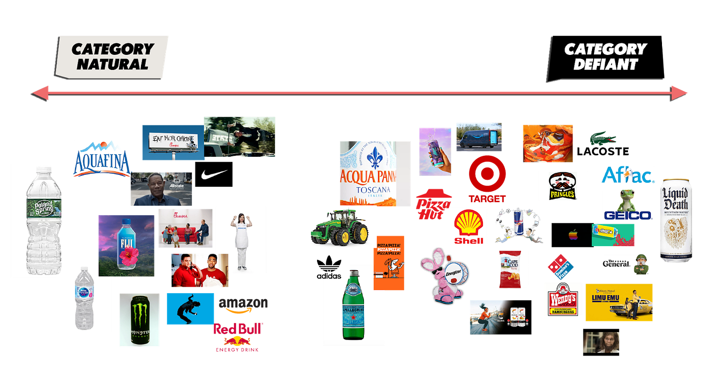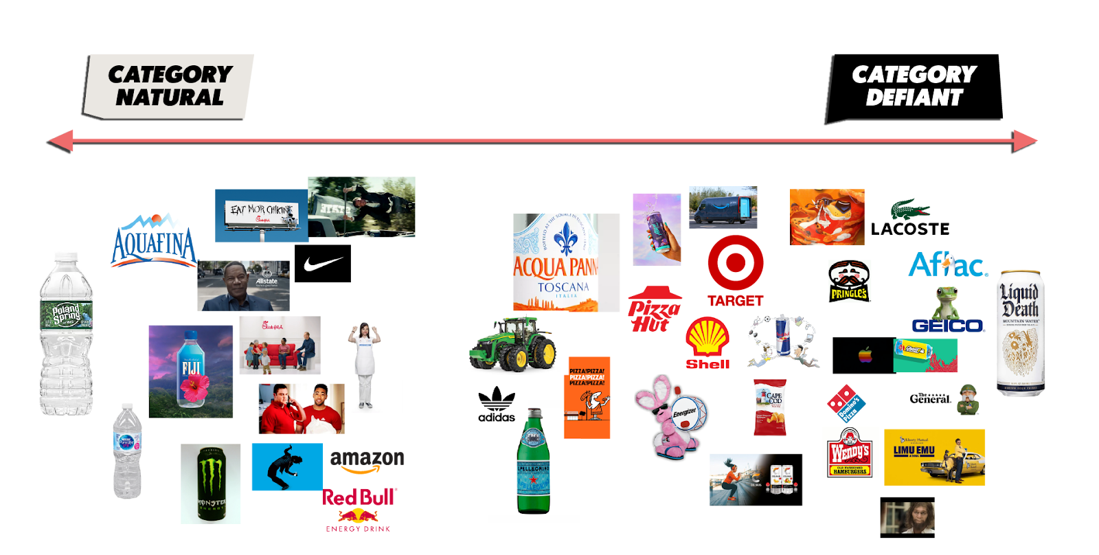 The concept is best understood by its opposite: category-natural cues. A waterfall logo, for instance, is category-natural for a water brand. By contrast, a waterfall logo for a car insurance brand is Category-Defiant. While this is an obvious example, category-natural cues can also include style, tone, or subtle cultural elements. Fiji Water’s hibiscus evokes nature and purity, fitting the category without being literal. On its own, it might have blended in—but paired with Fiji’s distinctive bottle shape, it becomes unique.